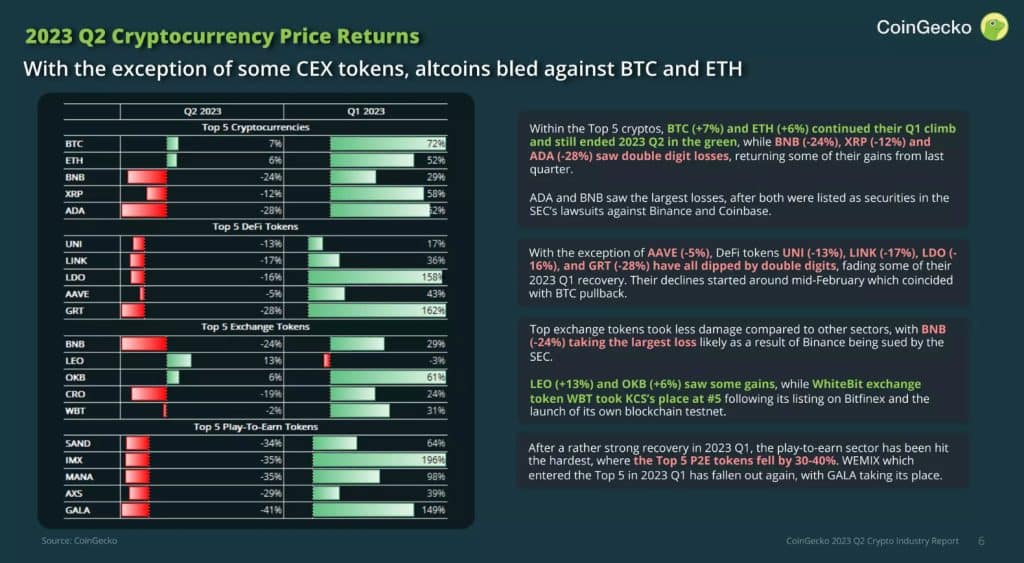 CoinGecko ระบุว่า BNB และ ADA ขาดทุนมากที่สุดเนื่องจากทั้งคู่ถูกระบุว่าเป็นหลักทรัพย์ในการฟ้องร้องของ Binance และ Coinbase ที่ยื่นโดยสำนักงานคณะกรรมการกำกับหลักทรัพย์และตลาดหลักทรัพย์ (SEC)