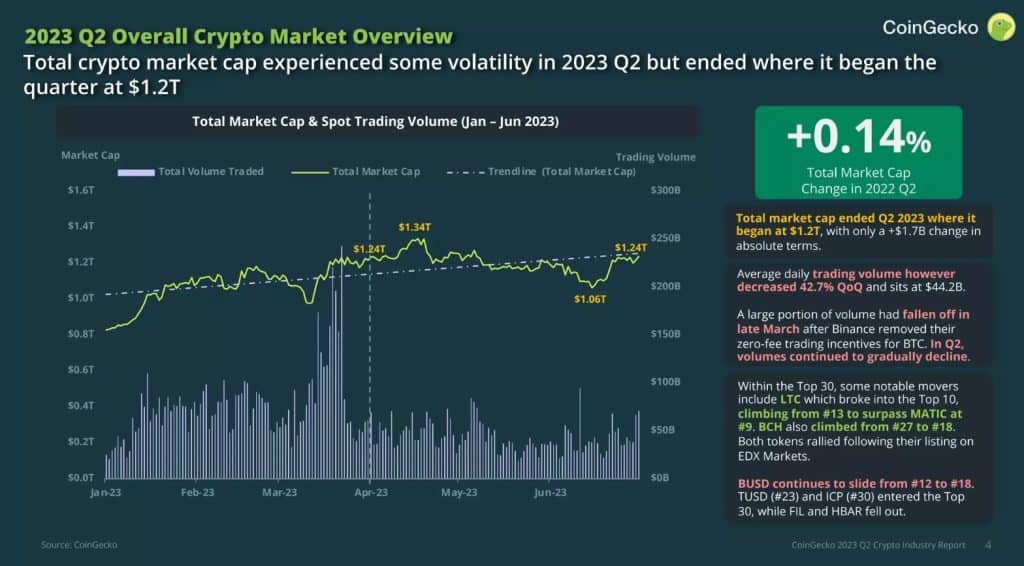 CoinGecko รายงานว่ามูลค่าตลาดทั้งหมดยังคง sideway สำหรับไตรมาสนี้ ซึ่งสิ้นสุดที่ 1.2 ล้านล้านดอลลาร์ ในขณะที่เขียน