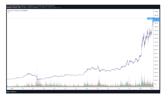 Ether ( ETH ) ไต่ระดับขึ้นสู่จุดสูงสุดใหม่ตลอดกาลที่ 1,763 ดอลลาร์ โดยที่ ETH CME futures มีกำหนดเปิดตัวในวันที่ 9 กุมภาพันธ์ ซึ่งทำให้นักวิเคราะห์หลายคนคาดการณ์ว่า altcoin ที่ติดอันดับสูงสุดจะแตะ 2,000 ดอลลาร์ได้ก่อนที่จะพบกับแนวต้านที่สำคัญใด ๆ