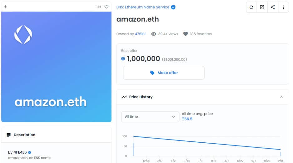 โดเมน ENSชื่อว่า Amazon.eth ได้รับข้อเสนอซื้อมูลค่า 1 ล้าน USDC จากที่อยู่กระเป๋าเงินที่ไม่ระบุตัวตนบน OpenSea โดยข้อเสนอในการซื้อโดเมน ENS ถูกปฏิเสธและไม่มีการทำธุรกรรมใด ๆ เกิดขึ้น ซึ่งชื่อโดเมนนี้ถูกขายครั้งสุดท้ายเมื่อ 5 เดือนที่แล้วในราคา 33 Ether (มูลค่าประมาณ 100,000 ดอลลาร์ในขณะนั้น)