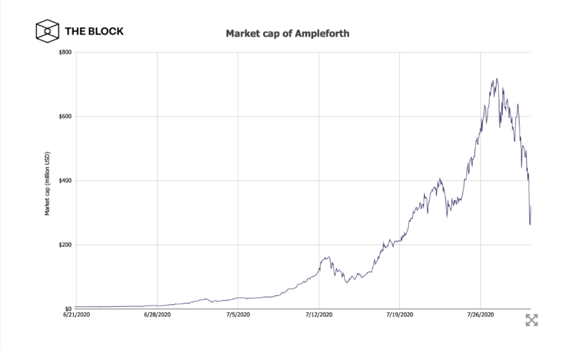 market cap ของ AMPL ซึ่งเป็นโทเค็นของ Ampleforth protocol ลดลงมากกว่า 60% ในช่วงสามวันที่ผ่านมา จากประมาณ 719 ล้านดอลลาร์เมื่อวันจันทร์ที่ผ่านมา ลดลงสู่ระดับต่ำสุดที่ 262 ล้านดอลลาร์ในวันนี้ก่อนที่จะฟื้นตัวเล็กน้อยสู่ระดับ 323.8 ล้านดอลลา