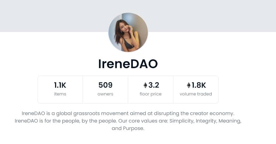 ในขณะที่บางคนมองว่านี่เป็นคอลเลกชัน NFT ดาด ๆ ทั่วไป แต่ดูเหมือนว่า IreneDAO จะมีความทะเยอทะยานที่ยิ่งใหญ่กว่า โดยในวันเสาร์ Zhao ได้โพสต์ทวีตระบุว่าจะนี่จะเป็น "การเคลื่อนไหวระดับรากหญ้า" สำหรับเศรษฐกิจของครีเอเตอร์ และเธอเสริมว่าค่านิยมหลักของ DAO คือ "Simplicity, Integrity, Meaning, and Purpose” ซึ่งน่าจะหมายถึงการอ้างอิงจากคำว่า “simp”— คำแสลงทางอินเทอร์เน็ตสำหรับบุคคลซึ่งมักจะเป็นผู้ชายที่แสดงความรักต่อบุคคลอื่นมากเกินไป และมักจะเป็นผู้หญิงเพื่อเรียกร้องความสนใจ