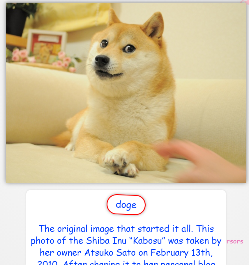 “หลังจากแชร์ในบล็อกส่วนตัวของเธอพร้อมกับภาพชุดอื่น ๆ ที่มีชื่อเสียงภายใต้ชื่อ 'เดินเล่นกับ Kabosu-chan' รูปภาพเหล่านี้ก็เริ่มกลายมีมของ Doge และเผยแพร่บนเว็บตั้งแต่นั้นเป็นต้นมา