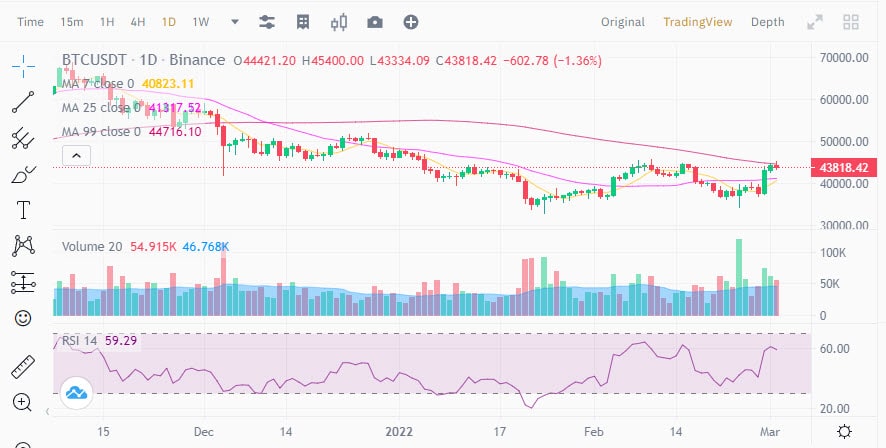 ราคาของ BTC ได้แกว่งไปมาระหว่าง $43,350 ถึง $45,400 ในวันที่ผ่านมา ในขณะที่โลกกำลังรอคอยรูปแบบการแก้ปัญหาความขัดแย้งในปัจจุบัน