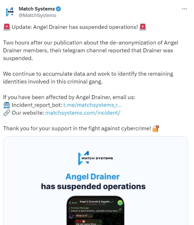 จากนั้นประมาณ 4 ชั่วโมงต่อมา บริษัทก็ได้ประกาศว่าได้ค้นพบหลักฐานว่า Angel Drainer ได้ปิดตัวลงแล้ว โดยระบุว่า “อัปเดต : Angel Drainer ได้ระงับการดำเนินงานแล้ว!” “2 ชั่วโมงหลังจากที่เราเผยแพร่ข้อมูลเกี่ยวกับการเปิดเผยตัวตนของสมาชิก Angel Drainer ต่อมาทางช่อง Telegram ของพวกเขาก็ได้มีการรายงานว่า Drainer ถูกระงับ”