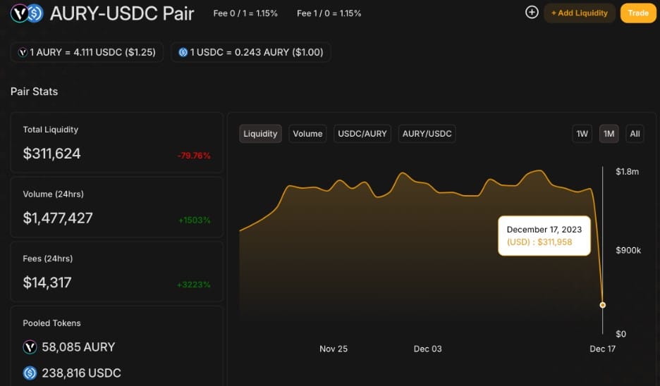 มีรายงานว่า Aurory ระบบนิเวศน์เกมบน Solana ถูกโจตีเมื่อวันที่ 17 ธันวาคม ส่งผลให้สภาพคล่องของพูล AURY-USDC ลดลงเกือบ 80% จาก Decentralized Exchange (DEX) Carmelot