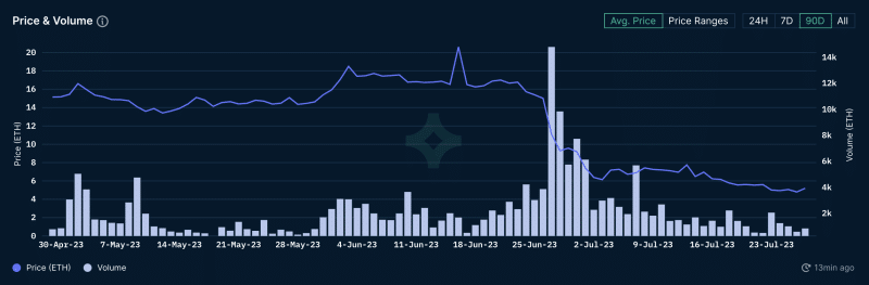 ย้อนไปในวันที่ 26 มิถุนายน หนึ่งวันก่อนที่ Elementals จะเปิดตัว ราคา Azuki อยู่ที่ประมาณ 15 ETH ($28,250) แต่ในเดือนต่อมา ราคา floor ลดลงเหลือ 5 ETH ($9,724) ณ วันที่ 27 กรกฎาคม ขณะที่ปริมาณการซื้อขาย Azuki ลดลง 78% ในเดือนนี้