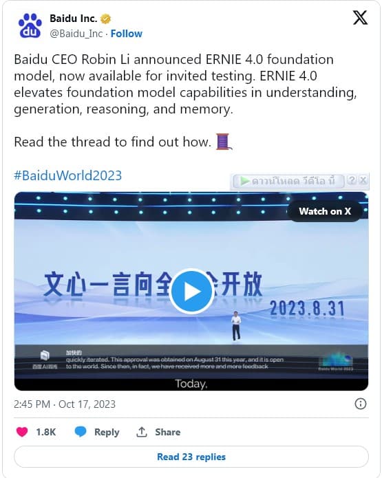 ไป่ตู้ (Baidu) เปิดตัว "Ernie 4.0" แชตบอท AI เวอร์ชันล่าสุดที่ประสิทธิภาพโดยรวม 'ทัดเทียม ChatGPT'