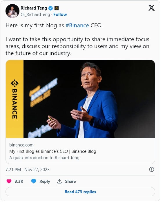 ในบล็อกโพสต์เมื่อวันที่ 27 พฤศจิกายน Teng กล่าวว่าเขาได้รับการสนับสนุนจาก CZ และความเป็นผู้นำของ Binance หลังจากการออกไปของอดีต CEO ซึ่งเป็นส่วนหนึ่งของข้อตกลงกับเจ้าหน้าที่ของสหรัฐอเมริกา