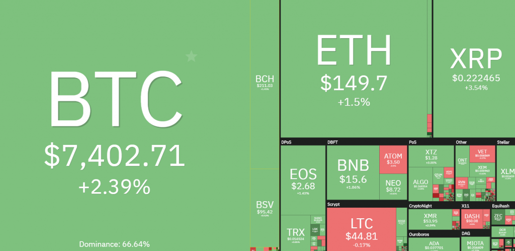 แต่ดูเหมือนว่ามันจะไม่เป็นอย่างที่ Peter Schiff พล่ามออกมาซักเท่าไหร่ เนื่องจาก Bitcoin เหมือนจะมีการฟื้นหลังจากร่วงไประดับ 7,200 ดอลลาร์ โดยตอนนี้ขึ้นมาอยู่ที่ประมาณ 7,400 ดอลล่าร์ เพิ่มขึ้น 2.39%