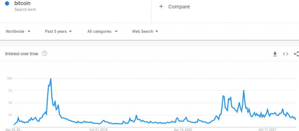 อย่างไรก็ตาม ราคาของสกุลเงินดิจิทัลลดลงเกือบ 50% ในเวลาประมาณครึ่งปี และข้อมูลจาก Google Trends ในขณะนี้ก็แสดงให้เห็นว่าการค้นหา “Bitcoin” ได้ลดลงและลงสู่ระดับต่ำสุดที่เห็นล่าสุดในเดือนธันวาคม 2020