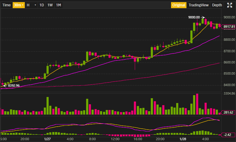 เมื่อช่วงดึกของวันนี้ ราคา Bitcoin สามารถขึ้นไปได้ถึง $9,000 เพิ่มขึ้นประมาณ 3.96% ในช่วง 24 ชั่วโมงที่ผ่านมา