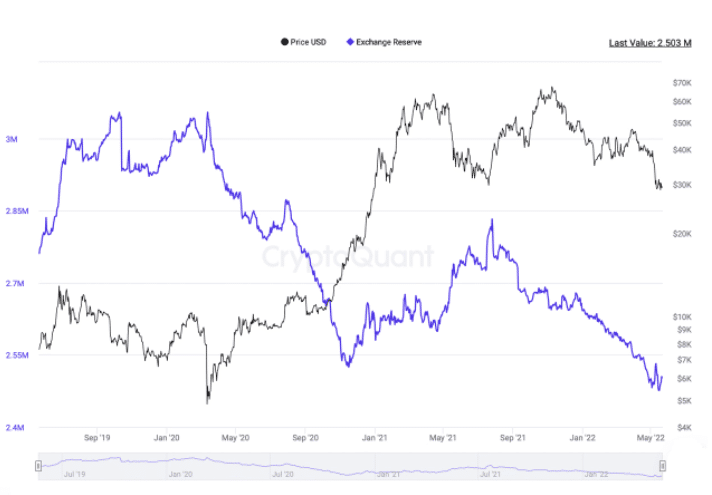 ข้อมูลจาก cryptoquant.com แสดงให้เห็นว่า มี 2.481 ล้าน BTC ในเว็บเทรด ซึ่งจำนวนนี้ต่ำกว่าจำนวน BTC เมื่อวันที่ 15 พฤศจิกายน 2020 1.70% อย่างไรก็ตาม ท่ามกลางการล่มสลายของ Terra blockchain และเหตุการณ์ de-pegging UST มีการฝาก BTC เพิ่มเข้ามาระยะสั้น ๆ แต่จำนวน bitcoin ในเว็บเทรดก็ยังคงต่ำกว่าที่เคยเป็นมา