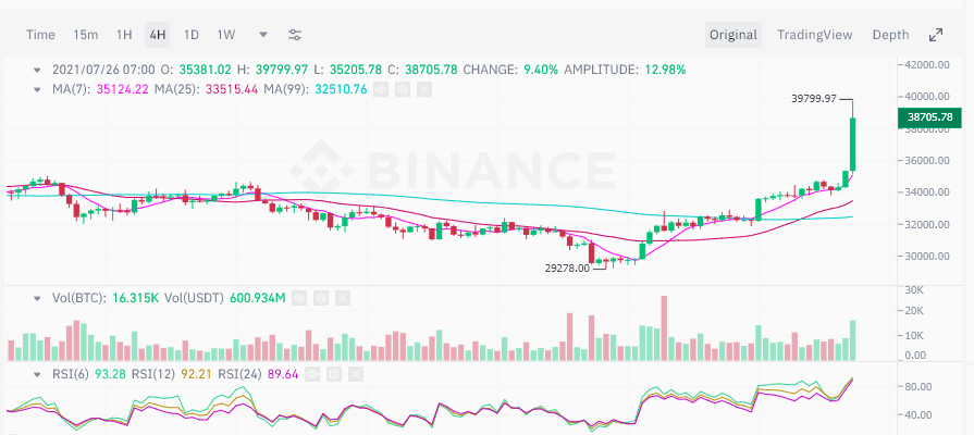 ก่อนหน้านี้ราคา Bitcoin ฟื้นกลับมาที่ประมาณ $35,000 ก่อนที่จะเพิ่มขึ้นอย่างรวดเร็วจะไปถึงระดับ $39,700 ดอลล่ารเมื่อเช้าวันนี้