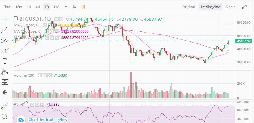 ราคาของ bitcoin ซื้อขายอยู่ที่ประมาณ $45,800 ในขณะที่เขียน ซึ่งเพิ่มขึ้นมากกว่า 30% ในช่วงเดือนที่ผ่านมา โดยครั้งสุดท้ายที่สกุลเงินดิจิทัลทำการซื้อขายในระดับนี้คือในเดือนพฤษภาคม