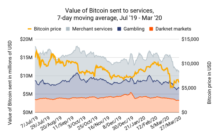 รายงานดังกล่าวเผยแพร่เมื่อวันที่ 30 มีนาคม ซึ่งเป็นการวิเคราะห์ผลกระทบของ COVID-19 กับผู้บริโภคที่นิยมใช้งาน Bitcoin ซึ่งพบว่าการใช้งาน Bitcoin ที่เกี่ยวข้องกับร้านค้า , เว็บพนัน , Darknet ได้รับผลกระทบไปทั้งหมด