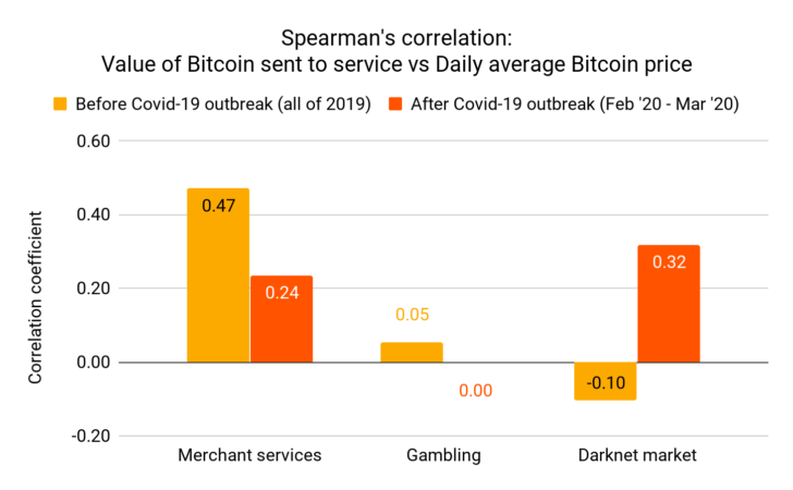 แต่แท้จริงแล้ว ความสัมพันธ์ระหว่างการใช้บริการของร้านค้าและราคาของ Bitcoin ลดลงเกือบ 50% นับตั้งแต่มีการระบาดของไวรัส COVID-19 รายงานคาดการณ์ว่าผลลัพธ์นี้อาจเกิดจากการปิดธุรกิจในท้องถิ่นที่มีการระบาดใหญ่ โดยผู้ใช้ Bitcoin อาจหันมาจ่ายค่าบริการต่าง ๆ ที่ไม่สามารถจ่ายได้ด้วยสกุลเงิน fiat ได้ หรือบริการที่ต้องมีการชำระเงินเป็นประจำ เช่น เว็บโฮสติ้ง ก็อาจมีส่วนทำให้ตัวเลขในส่วนของร้านค้านั้นยังคงที่
