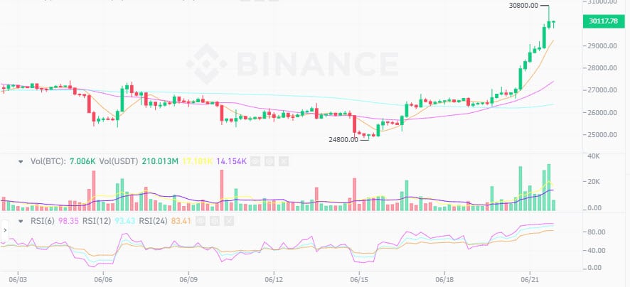 ราคา Bitcoin (BTC) พุ่งทะลุ 30,800 ดอลลาร์ ซึ่งเป็นระดับสูงสุดของสกุลเงินดิจิทัลที่ใหญ่ที่สุดนับตั้งแต่กลางเดือนเมษายน