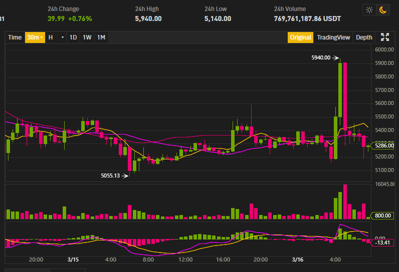 ราคา Bitcoin ( BTC ) เพิ่มขึ้นถึง 14.33% สู่ระดับสูงสุดรายวันที่ 5,940 ดอลลาร์ หลังจากธนาคารกลางสหรัฐ (FED) เซอร์ไพรส์ด้วยการประกาศปรับลดอัตราดอกเบี้ยนโยบายจากระดับ 1.00-1.25% ลงเหลือ 0.00-0.25% แต่หลังจากนั้นราคาก็ถูกทุบกลับลงมาที่เดิม