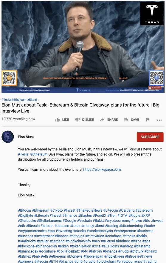 โดยการหลอกลวงนั้นอ้างว่า Microsoft นั้นได้ลงทุนกับ Bitcoin และจะทำการแจก Bitcoin จำนวน 5000 Bitcoin โดยอ้างว่าจะมีการส่ง Bitcoin กลับไปในจำนวนสองเท่าของที่ส่งมา ซึ่งพอทีมงานได้ทำการตรวจสอบพบว่ามี Account จำนวนมากได้ทำการ live video นี้ซึ่งพบว่าบาง Account นั้นเป็นของ Streamer เกมที่มีผู้ติดตามจำนวนมาก