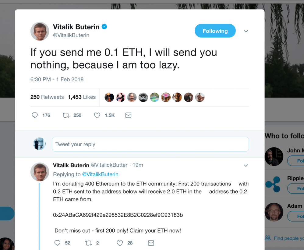 ซึ่งหลังจากเหตุการณ์นี้ Vitalik ตัวจริงก็ได้ออกมาทวีตว่าถ้าคุณส่ง Ether ไปให้เขา เขาจะไม่ส่งอะไรกลับไปให้เพราะเขาขี้เกียจเกินไปนั่นเอง