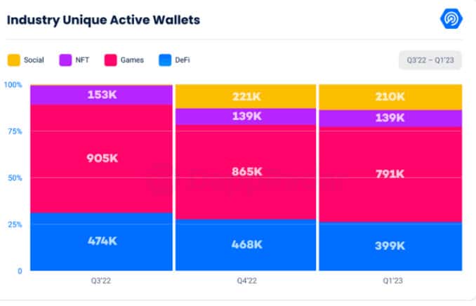 แม้ว่าจำนวน UAW จะลดลงเล็กน้อยในไตรมาสแรกของปี 2023 แต่ก็ยังสะท้อนถึงความเชื่อมั่นที่ดีเมื่อเปรียบเทียบจำนวน UAW ในด้านต่าง ๆ ของเกม, DeFi, NFT และโซเชียล