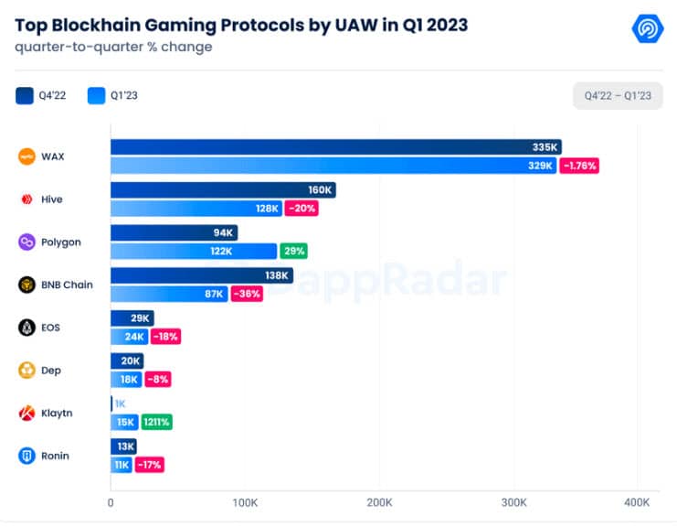 MATIC กลายเป็นผู้นำด้านบล็อกเชนเกม ด้วยตัวเลข UAW ที่เพิ่มขึ้น 29% และเพิ่มเป็น 122,000 ในไตรมาสแรกของปีจาก 94,000 รายการในไตรมาสก่อนหน้า ในทางกลับกัน KLAY สามารถสร้างรากฐานที่มั่นคงในฐานะบล็อกเชนสำหรับเล่นเกมโดยเพิ่มจำนวน UAW เป็น 15,000 ในช่วงสามเดือนแรกของปี