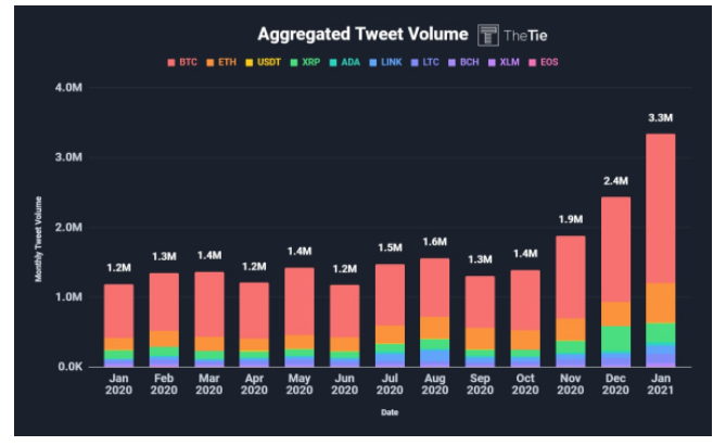 นอกจากนี้ การมีส่วนร่วมบนโซเชียลมีเดียอย่าง Twitter เกี่ยวกับ crypto ก็พุ่งสูงขึ้นเช่นกัน โดยปริมาณทวีตรวมที่เกี่ยวกับให้กับสกุลเงินดิจิทัลสูงถึง 3.3 ล้านในเดือนมกราคม เพิ่มขึ้นจาก 1.3 ล้านในเดือนกันยายน 2020 โดยปริมาณทวีตรวมของเดือนมกราคมสูงกว่าปีก่อนหน้า 181%