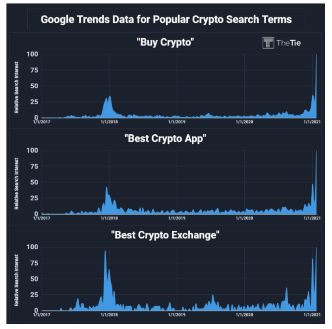 การค้นหา “Buy crypto” บน Google พุ่งขึ้นสู่จุดสูงสุดตลอดกาลในเดือนมกราคม ซึ่งสูงกว่าจุดสูงสุดก่อนหน้าของต้นปี 2018 ตามรายงานของบริษัทวิเคราะห์สกุลเงินดิจิทัล The Tie