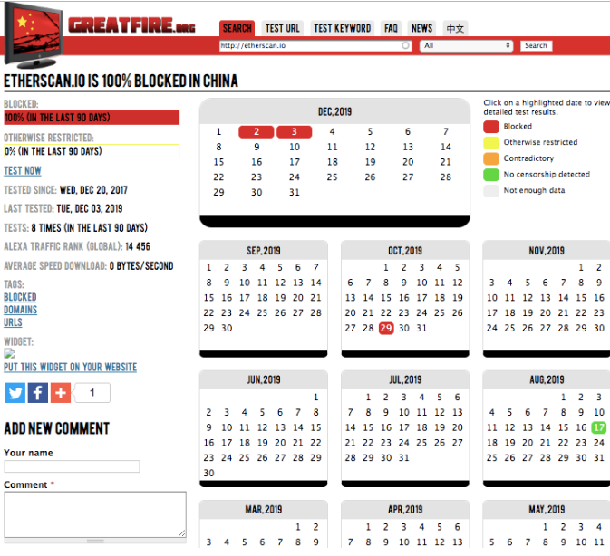 ตามรายงานจาก GreatFire ระบุว่า จีนได้ทำการบล็อค Etherscan ไปแล้วตั้งแต่เดือนตุลาคม 2019 โดยปัจจุบันโดเมน Etherscan ยังคงไม่สามารถเข้าถึงได้จากที่อยู่ IP ภายในจีนแผ่นดินใหญ่