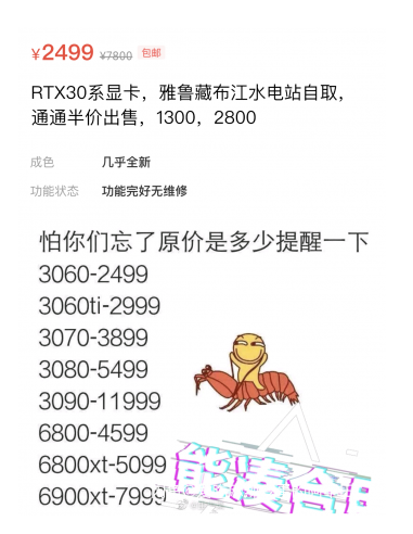 เจ้าของ GPU อีกคน ซึ่งได้ลงโฆษณาขายภายใน 30 วันที่ผ่านมากล่าวว่า GPU ซีรีส์ RTX 30 กำลังลดราคา 50% แต่ผู้ซื้อจะต้องมารับเองที่สถานีไฟฟ้าริมแม่น้ำ Yarlung Tsangpo