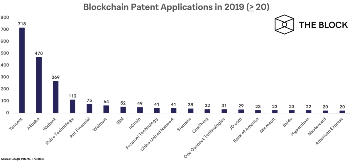 Tencent และ บริษัทในเครือยื่นขอจดสิทธิบัตร blockchain รวมกันทั้งสิ้น 718 รายการ จากทั้งหมดกว่า 5,800 รายการในขณะที่ Alibaba Group ยื่นจด 470 รายรวมกันคิดเป็นกว่า 20% ของทั้งหมด
