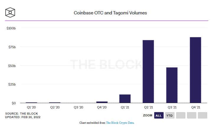 The Block ประมาณการว่าปริมาณการซื้อขายจาก OTC และนายหน้าชั้นนำได้แตะระดับสูงสุดเป็นประวัติการณ์ที่เกือบ 88 พันล้านดอลลาร์ในไตรมาสที่ 4 ของปี 2021 ซึ่งเกิดขึ้นในช่วงไตรมาสเดียวกันกับที่ Coinbase ได้ประกาศเปิดตัวธุรกิจหลักอย่างเต็มรูปแบบ ซึ่งเป็นการเคลื่อนไหวอย่างเต็มที่