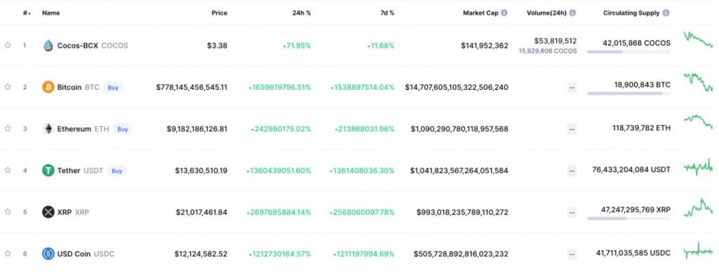 มูลค่าตลาดของ Bitcoin ในช่วงที่มีการแสดงข้อมูลผิดพลาดนั้นอยู่ที่ 14.7 quintillion นอกจากนี้ยังแสดงให้เห็นว่า Cocos-BCX ขึ้นมาอยู่อันดับแรกในรายการ แม้ว่าจะมีมูลค่าตลาดต่ำก็ตาม