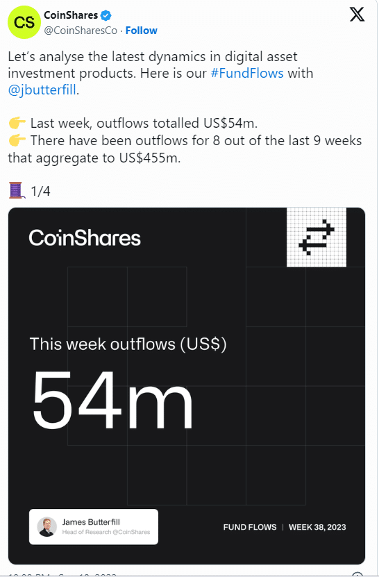 โดยตั้งแต่สัปดาห์ก่อนถึงวันที่ 18 กันยายน มีการไหลออกของเงินจำนวน 54 ล้านดอลลาร์ โดย BTC พบว่ามีการขาดทุนมากที่สุดจากผลิตภัณฑ์ ETP ทั้งหมด คิดเป็น 85% ของการไหลออกทั้งหมดจากกองทุนเหล่านี้ โดยเมื่อสัปดาห์ที่แล้ว Bitcoin มูลค่ากว่า 45 ล้านดอลลาร์ถูกขายเข้าสู่ตลาดโดย ETP
