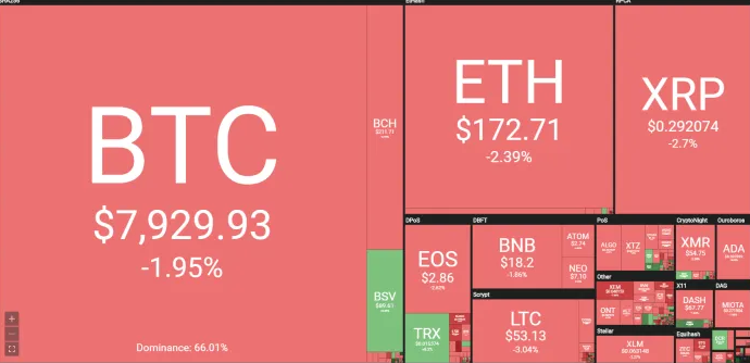 Bitcoin ซื้อขายที่ราคาต่ำกว่า $8,000 โดยมีระดับสูงสุดระหว่างวันอยู่ที่ 8,135 ดอลลาร์และลดลงอย่างต่อเนื่องจนถึง 7,900 ดอลลาร์ ก่อนที่จะตอนนี้ราคาปัจจุบันจะอยู่ประมาณที่ 7,929 ดอลลาร์ ลดลงประมาณ -1.95% ใน 24 ชั่วโมงที่ผ่านมา