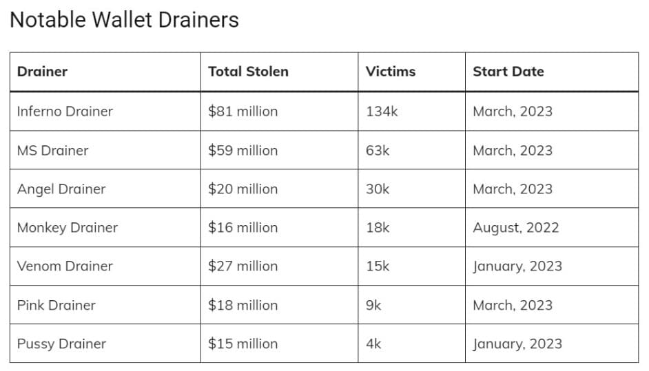 ในทำนองเดียวกัน Inferno Drainer ก็ปิดตัวลงในปี 2023 หลังจากขโมยสินทรัพย์ดิจิทัลไปประมาณ 81 ล้านดอลลาร์ และจากข้อมูลของ Scam Sniffer ดูเหมือนว่า Angel Drainer จะถูกยึดครองหลังจากที่ Inferno Drainer ปิดตัวลง