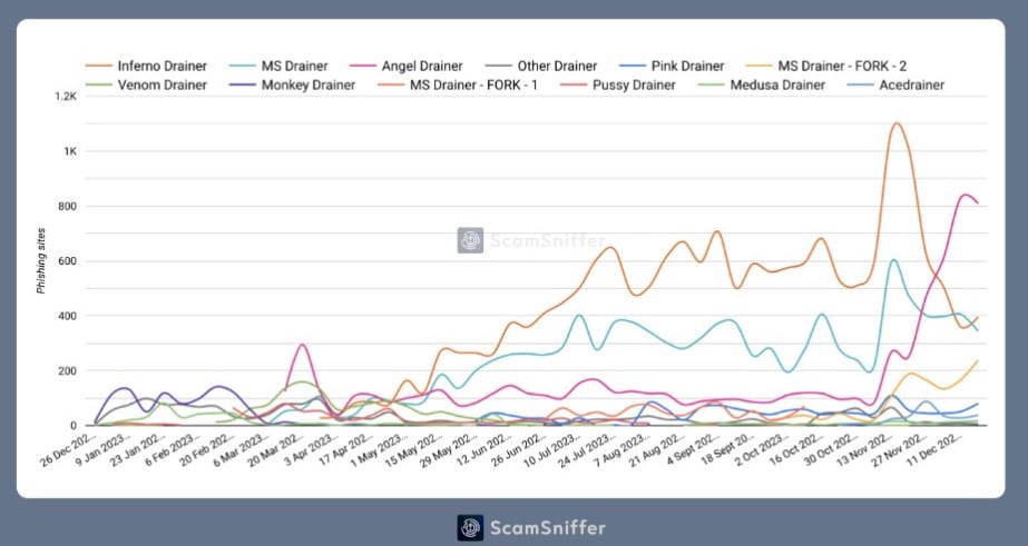 ใน “รายงาน Wallet Drainers ปี 2023” จากแพลตฟอร์มความปลอดภัยบล็อกเชน Scam Sniffer ได้วิเคราะห์แนวโน้มที่ใช้ในการหลอกลวง crypto โดยแพลตฟอร์มดังกล่าวเน้นย้ำว่ามีกิจกรรมฟิชชิ่งเติบโตอย่างต่อเนื่องตลอดปี 2023