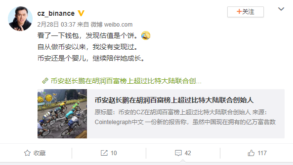 CZ ได้แสดงความเห็นของเค้าบน Weibo แพลตฟอร์มโซเชียลมีเดียของจีนว่า "ดูกระเป๋า Wallet ของผม...ผมไม่เคยขายมันเลยตั้งแต่มี Binance... Binance ยังคงเป็นเหมือนเด็กทารกและยังต้องเติบโตอย่างต่อเนื่องต่อไป"