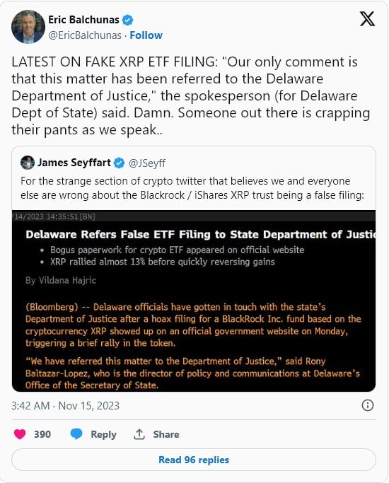 ในแถลงการณ์เมื่อวันที่ 14 พฤศจิกายน โฆษกกระทรวงการต่างประเทศเดลาแวร์บอกว่า การยื่นโดยอ้างผู้จัดการสินทรัพย์ BlackRock เพื่อจดทะเบียน "iShares XRP Trust" ปลอม จะถูกส่งต่อไปยังหน่วยงานของรัฐ ซึ่งการจดทะเบียนปลอมเมื่อวันที่ 13 พฤศจิกายน ทำให้ราคา XRP พุ่งขึ้นประมาณ 12% ชั่วครู่ ก่อนที่จะลดเมื่อมีการเปิดเผยข้อมูลว่าเป็นเท็จ