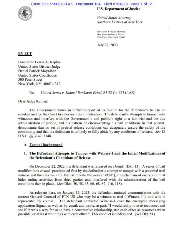 ตามการยื่นฟ้องของศาลเมื่อวันที่ 28 กรกฎาคม กระทรวงยุติธรรมของสหรัฐอเมริกา (DOJ) กำลังขอให้เพิกถอนการประกันตัวของ Sam Bankman-Fried (SBF) โดยกล่าวหาว่า เขาพยายามยุ่งเหยิงกับพยาน และทำไดอารี่ของ Caroline Ellison รั่วไหลไปยัง The New York Times