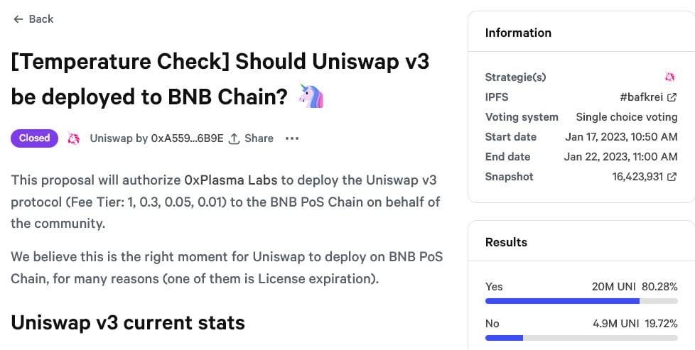 หลังจากการลงคะแนนเสียงในขั้นต้น ข้อเสนอนี้จะถูกย้ายไปสู่การลงคะแนน governance vote เต็มรูปแบบ โดยข้อเสนอนี้จัดทำโดย 0xPlasma Labs เพื่อที่จะปรับใช้ Uniswap v3 บน BNB Chain โดยเลือก Celer เป็น bridge protocol ที่ต้องการ ซึ่งจะช่วยให้ผู้ใช้สามารถส่งโทเค็นข้ามเครือข่ายไปยังบล็อกเชนต่าง ๆ ได้