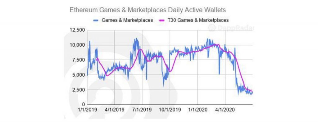 DApp ที่เกี่ยวกับเกมของ Ethereum ก็ได้รับความเดือดร้อนเนื่องจากค่าธรรมเนียมเป็นส่วนสำคัญของการทำธุรกรรมแต่ละครั้ง โดย DappRadar รายงานว่ากิจกรรมที่เกี่ยวกับเกมลดลง 79% เมื่อเทียบกับช่วงเดียวกันของปีก่อน