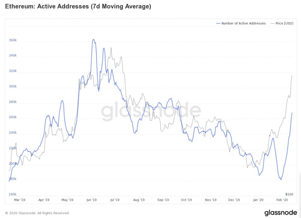 ตามข้อมูลที่เผยแพร่โดยบริษัทวิเคราะห์ทางด้านบล็อคเชน Glassnode ระบุว่า การเคลื่อนไหวของราคาที่น่าประทับใจของ Ethereum นั้นมาพร้อมกับปัจจัยพื้นฐานที่เพิ่มขึ้น หลังจากพบว่าจำนวนที่อยู่กระเปาที่ใช้งานเพิ่มสูงขึ้น 26.7 เปอร์เซ็นต์ในขณะที่ธุรกรรมของ ETH ก็เพิ่มขึ้น 20.77 เปอร์เซ็นต์
