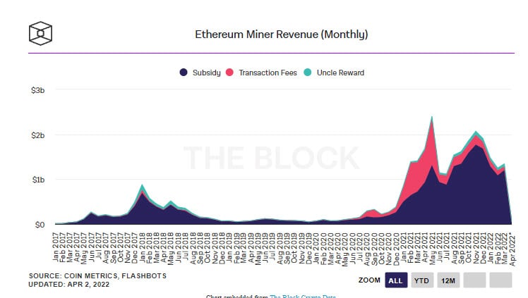 ผู้ขุด Ethereum ทำรายได้รวมกัน 1.29 พันล้านดอลลาร์ในเดือนมีนาคม เพิ่มขึ้นจากเดือนต่อเดือน 7.2% แต่พวกเขาอยู่ในวิถีที่ลดลงตั้งแต่เดือนพฤศจิกายนปี 2021 เมื่อรายได้รวมอยู่ที่ 2.07 พันล้านดอลลาร์