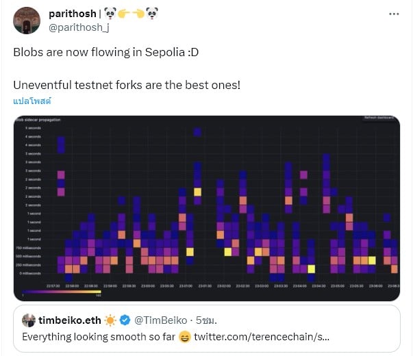 การใช้งาน Dencun บน Sepolia เริ่มต้นเมื่อเวลา 22:51 UTC ของวันอังคาร “ตอนนี้ Blobs กำลัง flow อยู่ใน Sepolia” Parithosh Jayanthi วิศวกร DevOps ของ Ethereum Foundation เขียนในโพสต์บน X