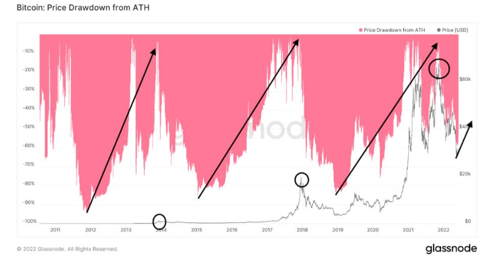เขาระบุถึงข้อมูลจาก Glassnode บริษัทวิเคราะห์ on-chain ซึ่งนำเสนอ drawdowns ของ BTC/USD จากระดับสูงสุดตลอดกาลในช่วงหลายปีที่ผ่านมา