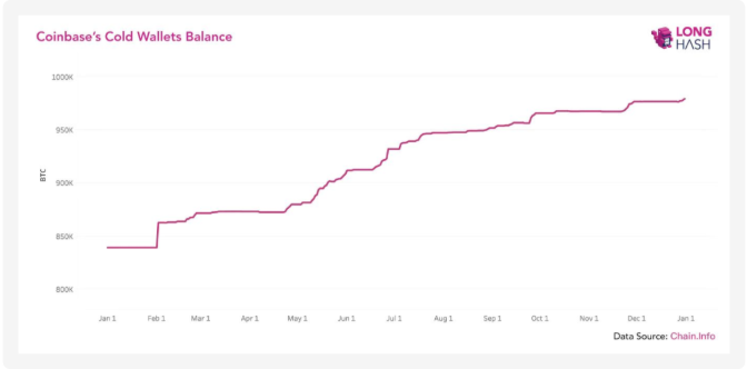 เมื่อวันที่ 23 มกราคม Longhash รายงานว่ากระเป๋า cold wallets ของ Coinbase มี Bitcoins อยู่ประมาณ 970,000 BTC (8 พันล้านเหรียญสหรัฐ) ณ วันที่ 1 มกราคม โดยหากระดับการเติบโตยังคงดำเนินต่อไป คาดว่าจะไปถึง 1,000,000 BTC ภายในเดือนกุมภาพันธ์