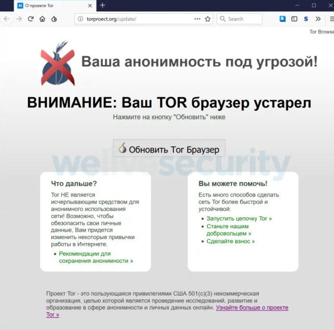 ตามที่ ESET รายงาน เจ้าเว็บไซต์ปลอมเหล่านี้จะมีการแสดงข้อความบอกผู้ใช้เบราว์เซอร์ Tor ของพวกเค้านั้นเป็นรุ่นเก่า แม้ว่าพวกเขาจะมีเวอร์ชั่นล่าสุดติดตั้งอยู่ก็ตาม และจะเสนอให้ดาวน์โหลดเวอร์ชันปลอมที่มีมัลแวร์แอบแฝงอยู่