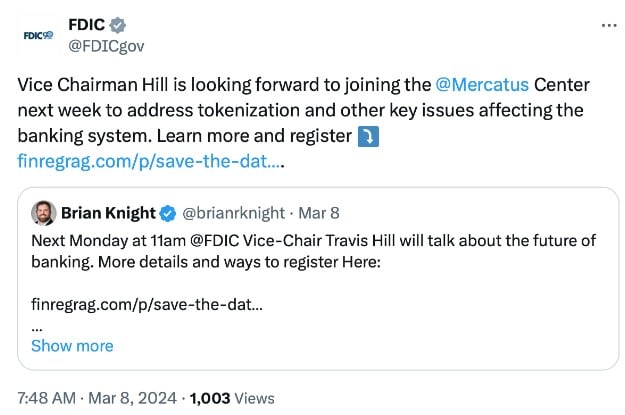"ลูกค้าธนาคารและเศรษฐกิจสหรัฐอเมริกาอาจสูญเสียโอกาสหากใช้แนวทางที่ไม่ดีในการควบคุมเทคโนโลยีบล็อคเชน" Travis Hill รองประธาน Federal Deposit Insurance Corporation (FDIC) กล่าวกับผู้ชมที่ Mercatus Center เมื่อวันที่ 11 มีนาคม โดย Hill กล่าวว่าเราตกอยู่ในความเสี่ยงแล้ว และ FDIC ก็มีส่วนรับผิดชอบในเรื่องนี้